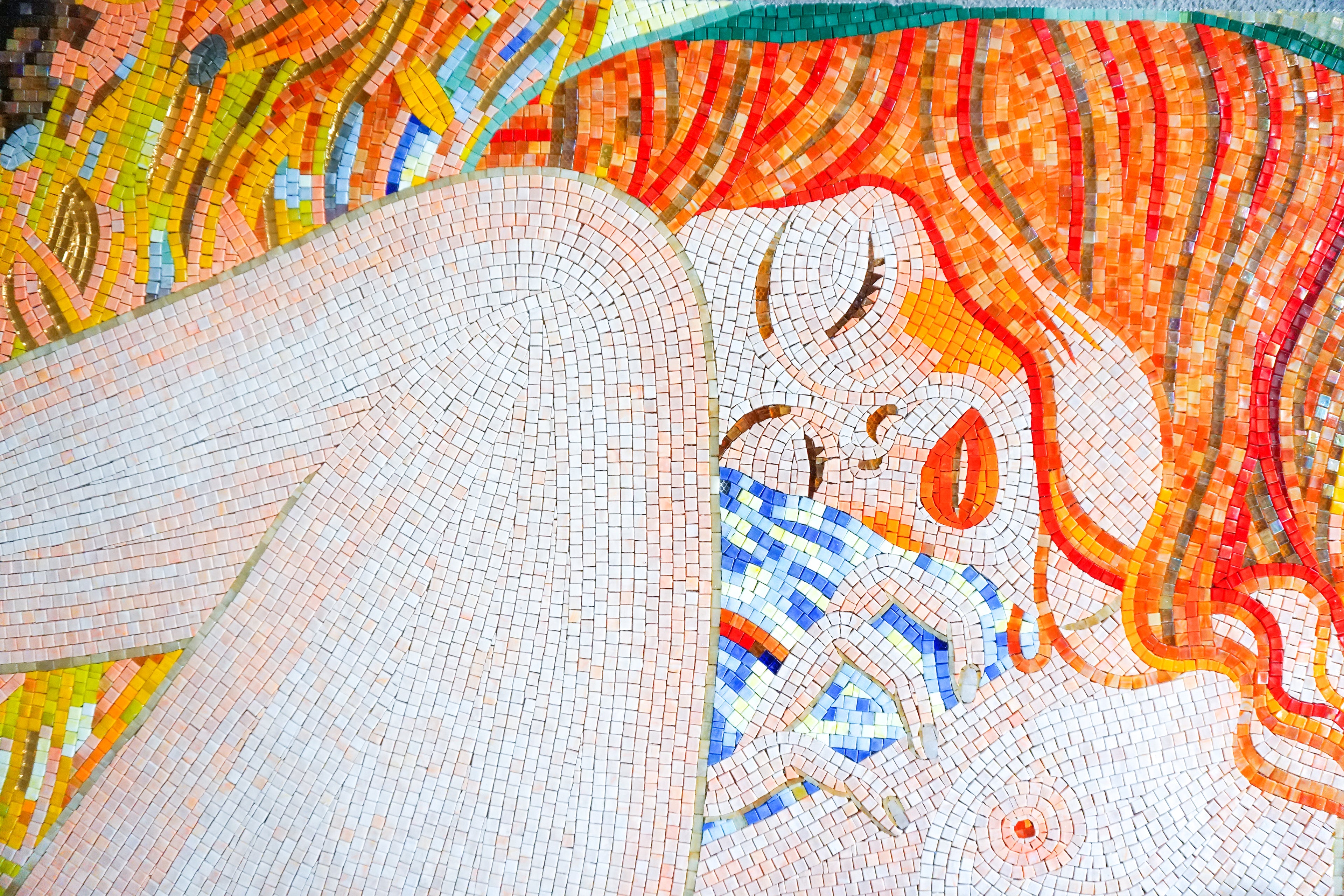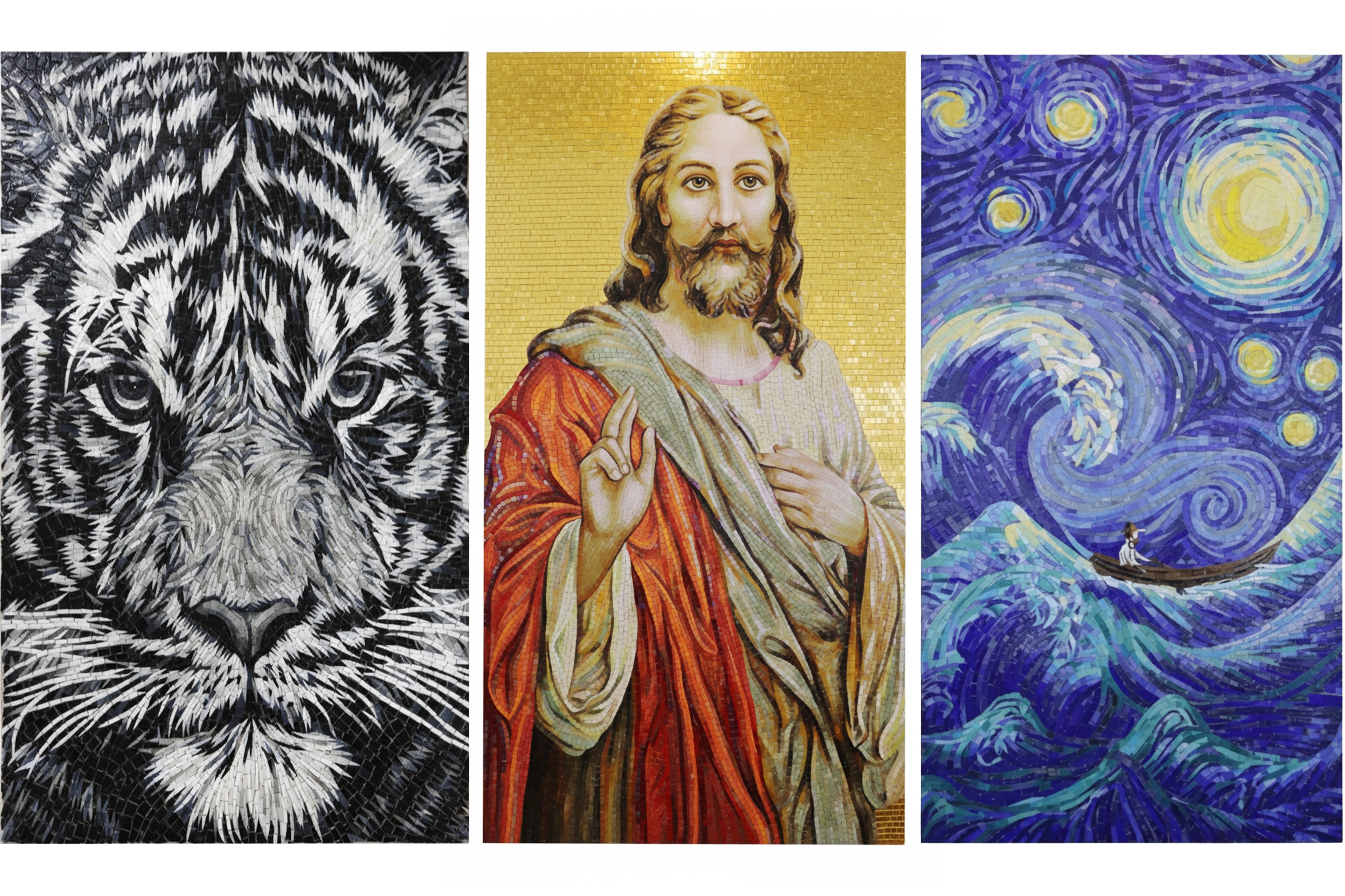 Explore Art Nouveau and classical glass mosaic portraits featuring golden accents and decorative elements. Learn about our comprehensive color supply capabilities and custom artistic services for interior design projects.