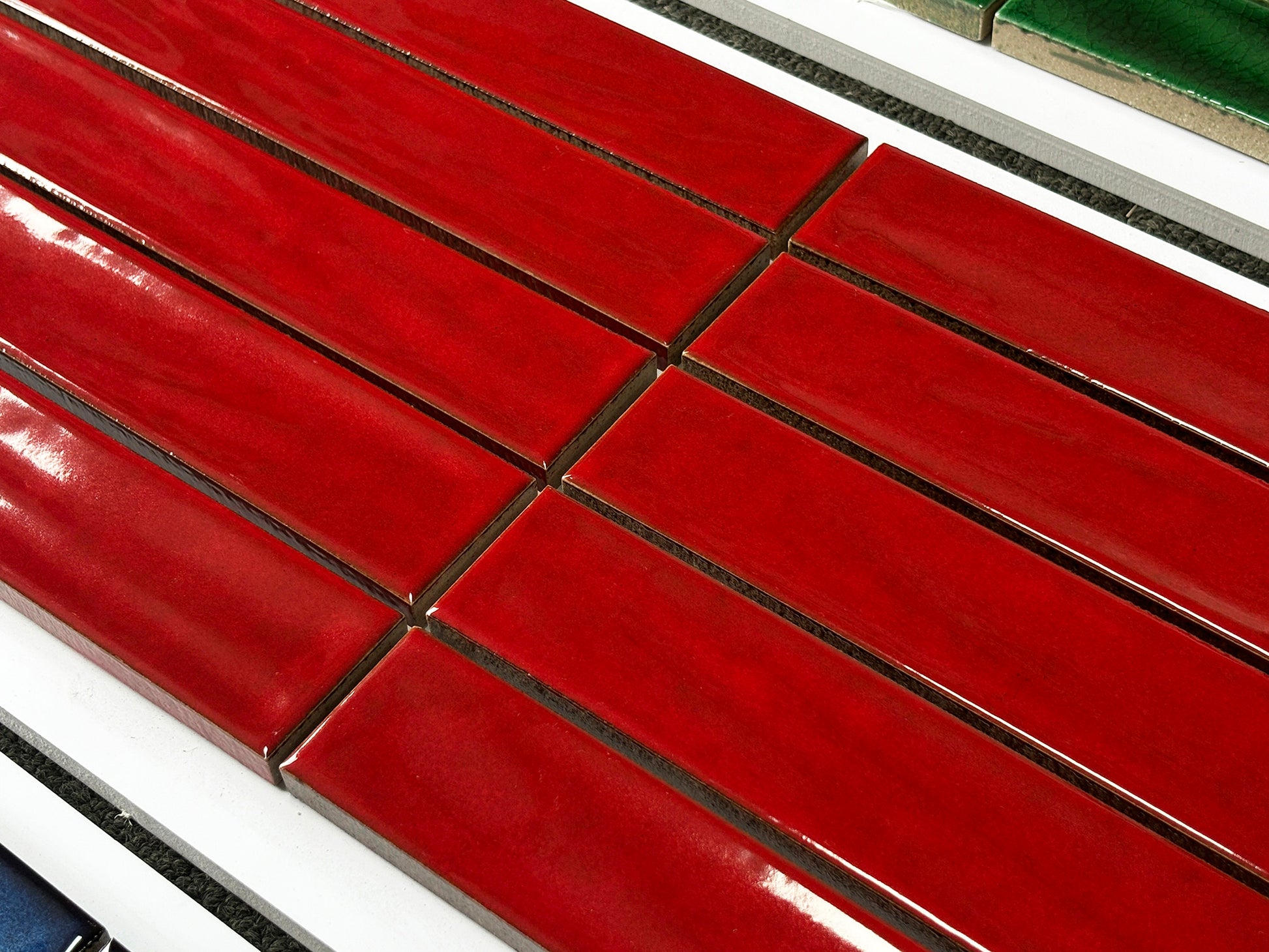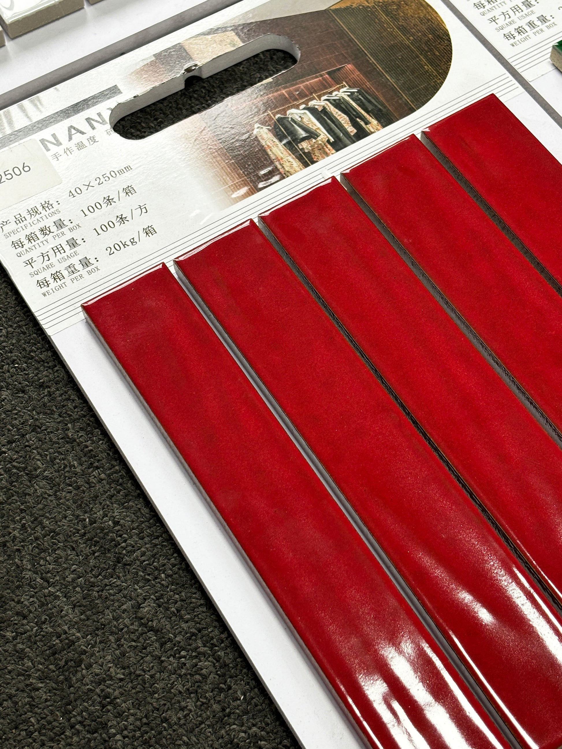 Premium handmade kiln-fired brick with dimensions 40mm x 250mm, featuring a rich deep crimson red finish with lustrous glazed surface that creates stunning visual impact. Each brick displays consistent deep red tones with subtle natural variations that showcase traditional handmade craftsmanship and bold color intensity.