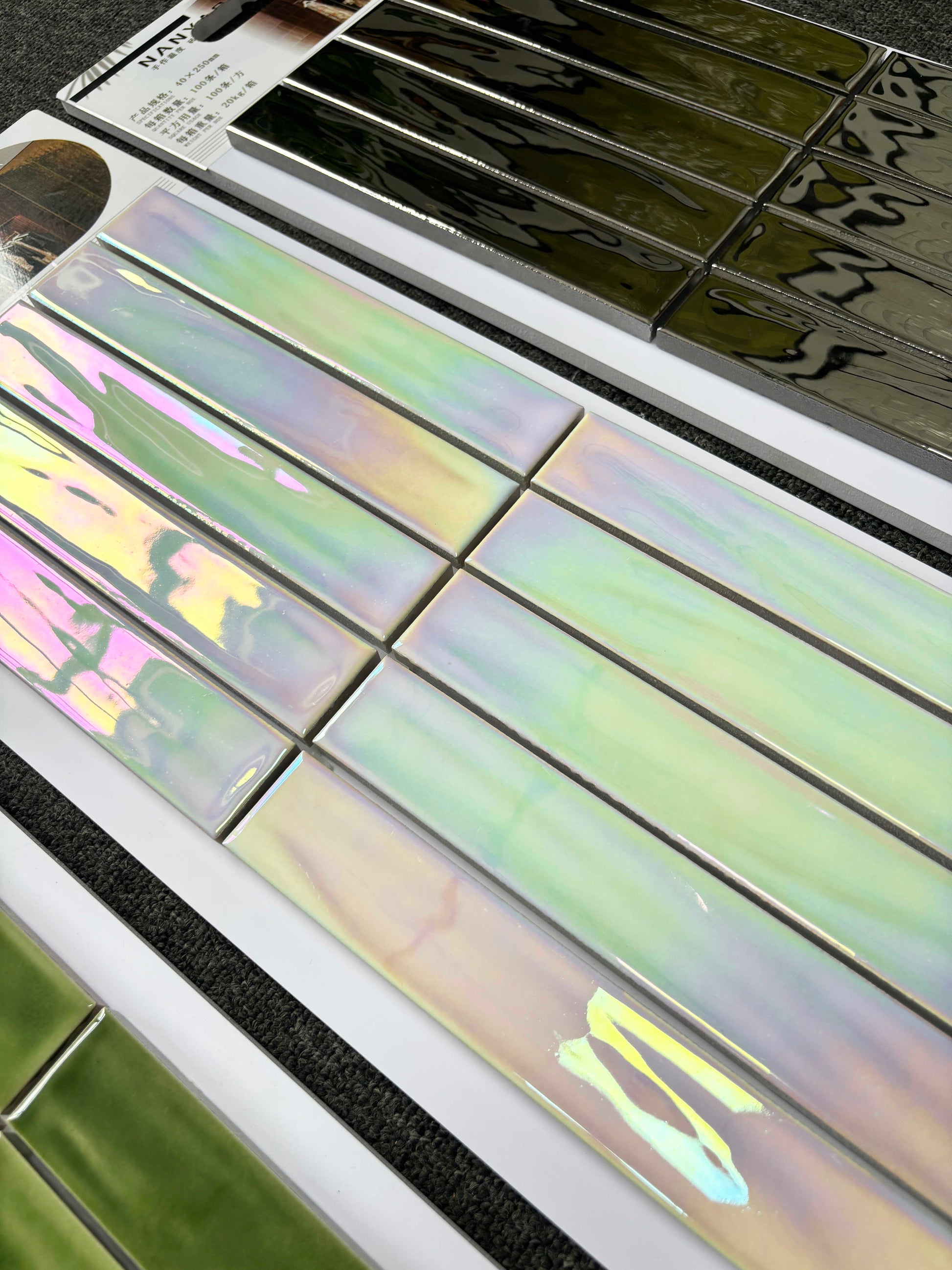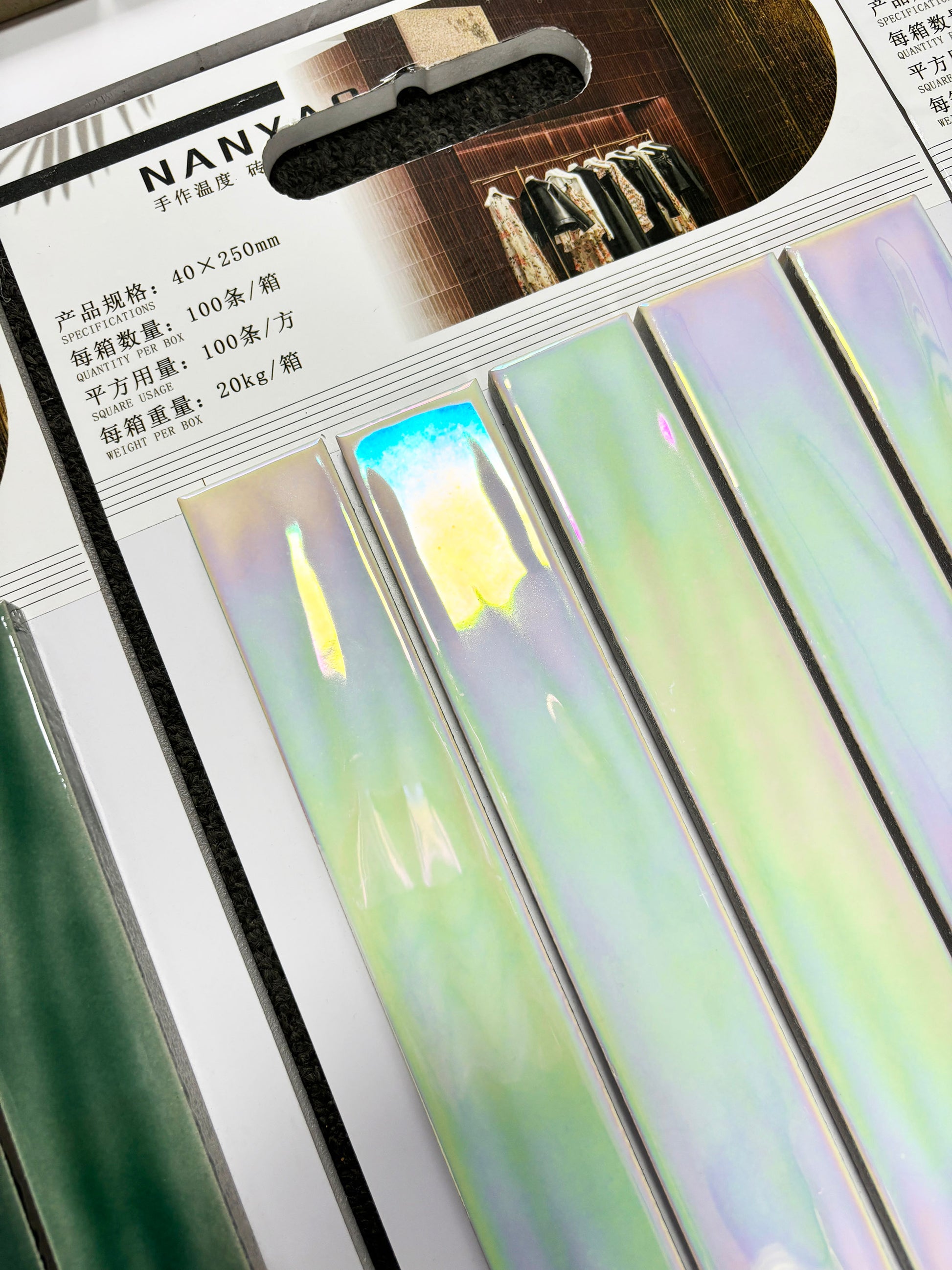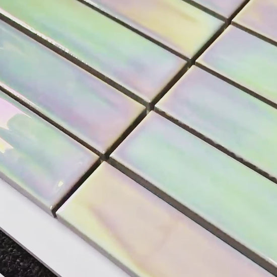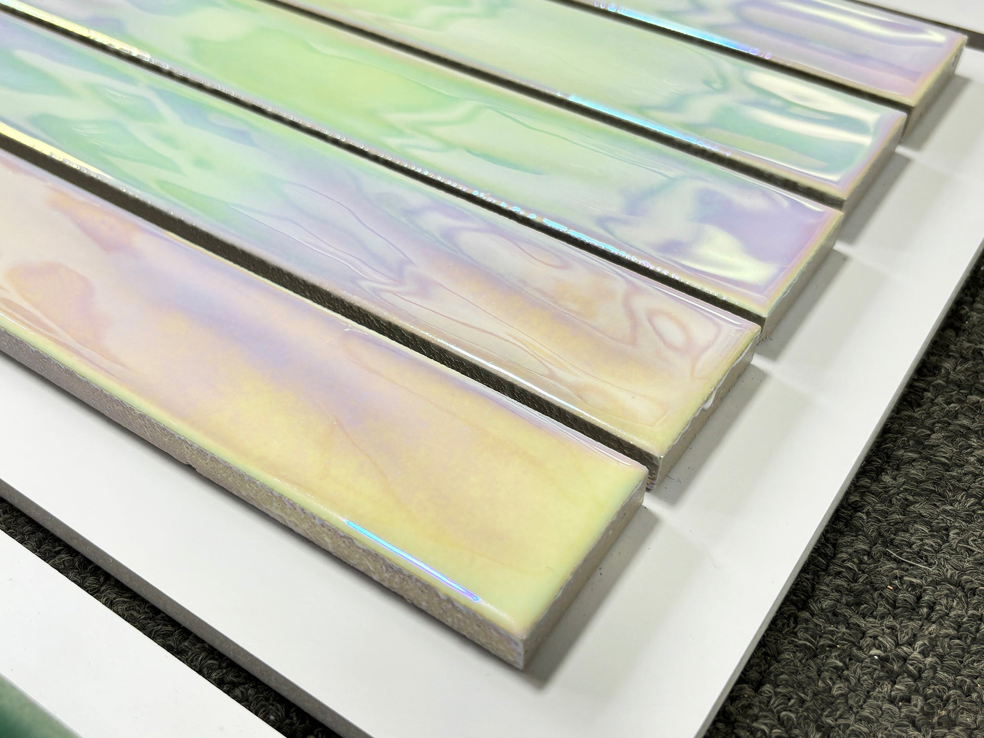Premium handmade kiln-fired brick with dimensions 40mm x 250mm, featuring a mesmerizing pearl iridescent finish that shifts through soft pastel hues of mint green, lavender purple, warm peach, and golden yellow. Each brick displays unique color variations that dance and change with viewing angle and lighting conditions.
