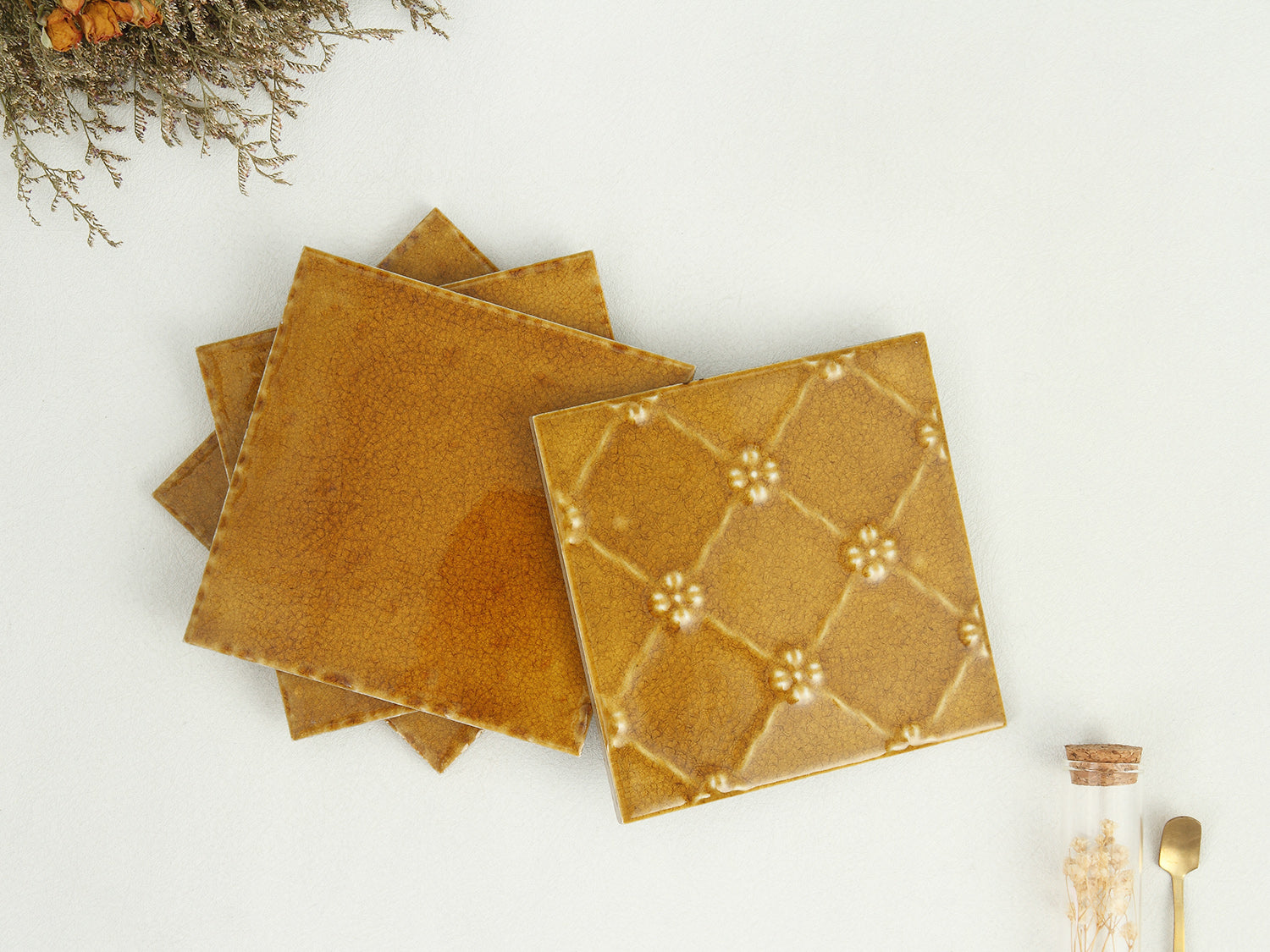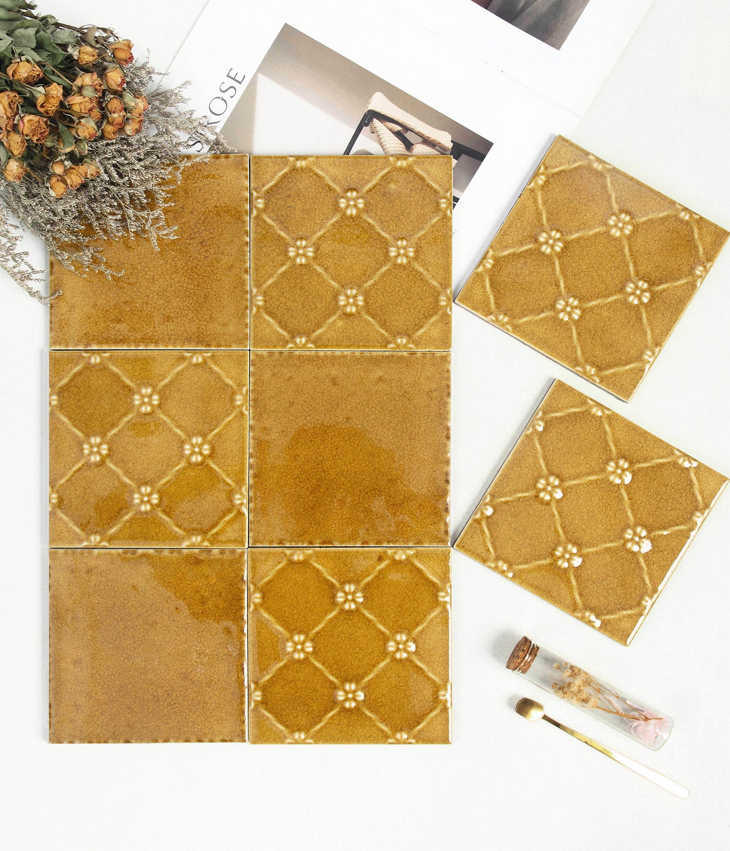 These exceptional tiles feature a rich golden amber glaze with distinctive ice crack patterns that create an elegant, artistic finish. The kiln-fired glaze produces natural color variations and unique crackle patterns, ensuring each tile is a one-of-a-kind work of art.