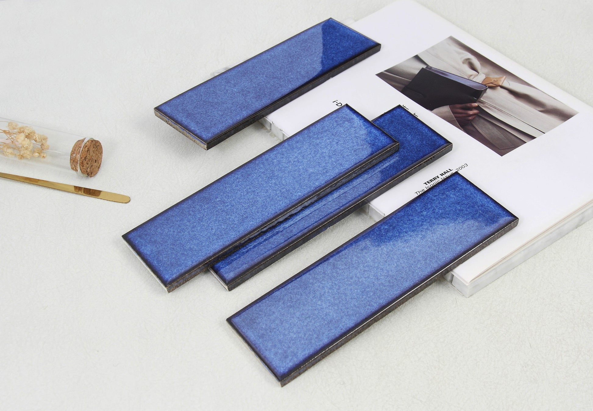These stunning 60x200mm ceramic tiles feature a captivating ice crack kiln change finish that creates a mesmerizing blue gradient surface reminiscent of a clear sky. Each tile displays beautiful transitions from deep ocean blue to soft sky blue, with smooth gradient effects and glossy finish that emerge from the specialized kiln firing process, creating a serene and sophisticated aesthetic.