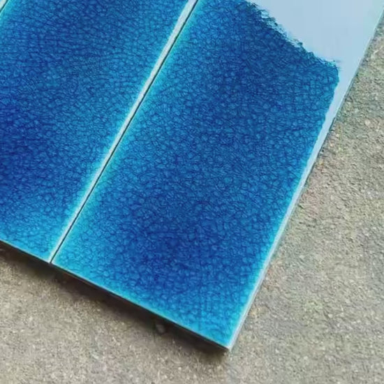 These striking 60x200mm ceramic tiles feature a captivating ice crack kiln change finish that creates a rich deep blue surface with dramatic textural patterns. Each tile displays intense deep blue tones with natural variations and bold crackle patterns that emerge from the specialized kiln firing process, creating a sophisticated oceanic aesthetic with stunning dual-tone contrasts.